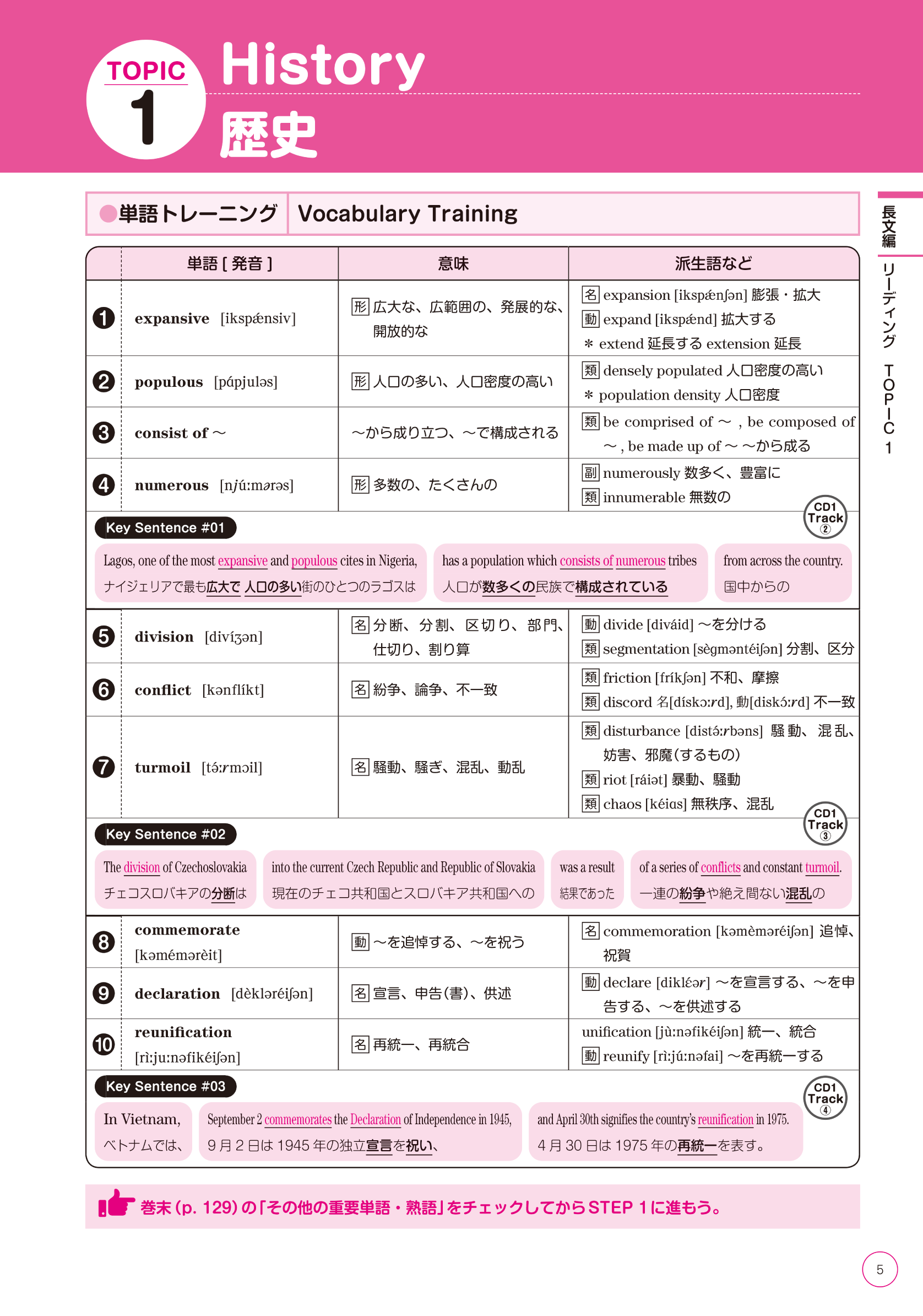 ・長文編「リーディング」と会話編「リスニング」で構成。